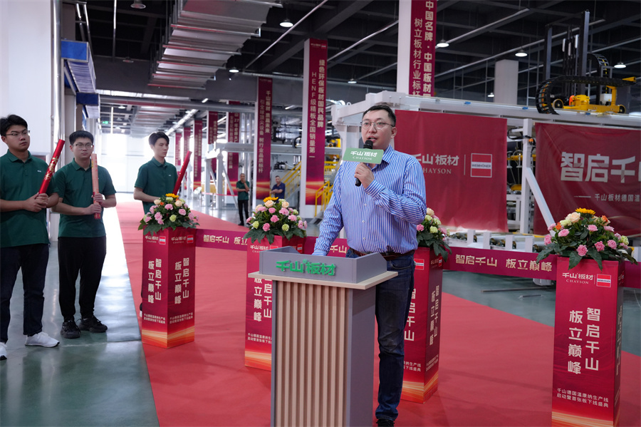 隨著彩帶落剪,啟動(dòng)指令同步發(fā)出,德國(guó)溫康納生產(chǎn)線開(kāi)啟運(yùn)轉(zhuǎn)!當(dāng)?shù)谝粡埥?jīng)由新生產(chǎn)線制造出的板材緩緩輸送至下線口時(shí),全場(chǎng)掌聲雷動(dòng),不僅宣告了千萬(wàn)級(jí)生產(chǎn)線的圓滿調(diào)試成功,更象征著千山品質(zhì)新紀(jì)元的開(kāi)啟。