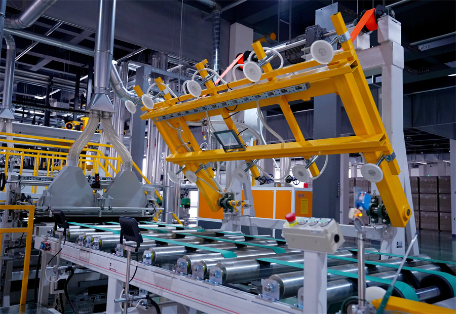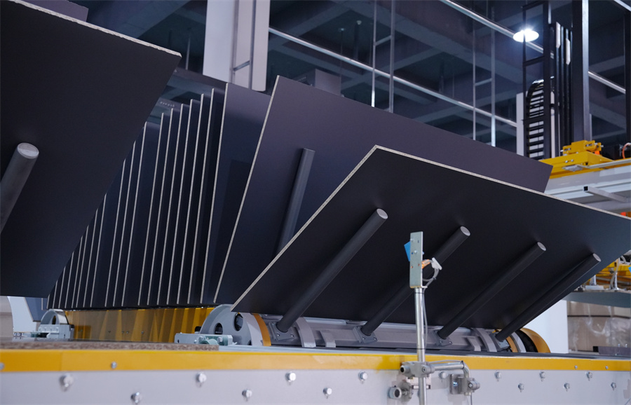 作為“壓貼領(lǐng)域的領(lǐng)導(dǎo)者”,溫康納在短周期壓貼領(lǐng)域處于世界領(lǐng)先地位,占據(jù)了國(guó)內(nèi)高端市場(chǎng)。相比于傳統(tǒng)壓貼產(chǎn)線數(shù)分鐘的周期,溫康納產(chǎn)線的壓貼周期大幅壓縮,效率提升數(shù)倍以上,產(chǎn)能可達(dá)到4800張/20小時(shí)。 溫康納智能化產(chǎn)線實(shí)現(xiàn)全流程自動(dòng)化無(wú)縫銜接,從自動(dòng)上下料、自動(dòng)進(jìn)板裝置到壓機(jī)壓貼、清邊倒角、翻板檢驗(yàn)等,每個(gè)環(huán)節(jié)都實(shí)時(shí)調(diào)控。更令人驚嘆的是紅外激光精準(zhǔn)對(duì)紋系統(tǒng),將誤差嚴(yán)格控制在毫米級(jí)以內(nèi),使板材紋理對(duì)接的美觀度實(shí)現(xiàn)質(zhì)的飛躍。 溫康納生產(chǎn)線保證了板材在最大壓貼范圍內(nèi)材料之間的最小厚度差,能夠更靈活地使用基材,同時(shí)確保產(chǎn)品質(zhì)量的穩(wěn)定性。溫康納的精密與進(jìn)口鋼板“珠聯(lián)璧合”,將使千山板材潮流花色達(dá)到行業(yè)新高度,實(shí)現(xiàn)高顏、高質(zhì)、高品體驗(yàn)。 溫康納生產(chǎn)線的引進(jìn)是千山智能制造戰(zhàn)略的重要組成部分。在消費(fèi)升級(jí)和產(chǎn)業(yè)轉(zhuǎn)型的大背景下,千山并沒(méi)有選擇簡(jiǎn)單擴(kuò)大產(chǎn)能的道路,而是通過(guò)引進(jìn)頂尖技術(shù)裝備,實(shí)現(xiàn)從“制造”到“智造”的跨越。