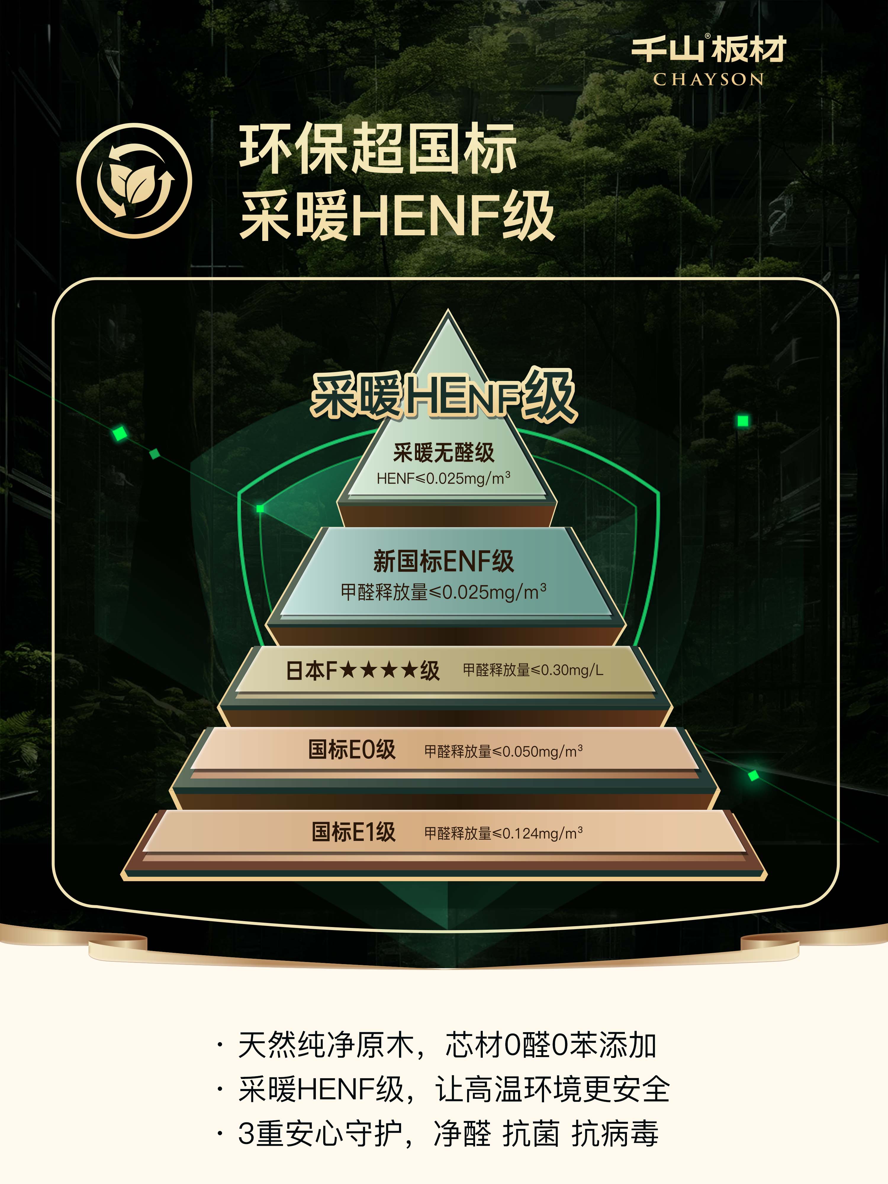 千山原木板質(zhì)地天然,綠色0醛0苯添加,環(huán)保達采暖HENF級,融入凈醛、抗菌、抗病毒功能工藝,讓家不止于美觀,更是一方安心健康的守護。